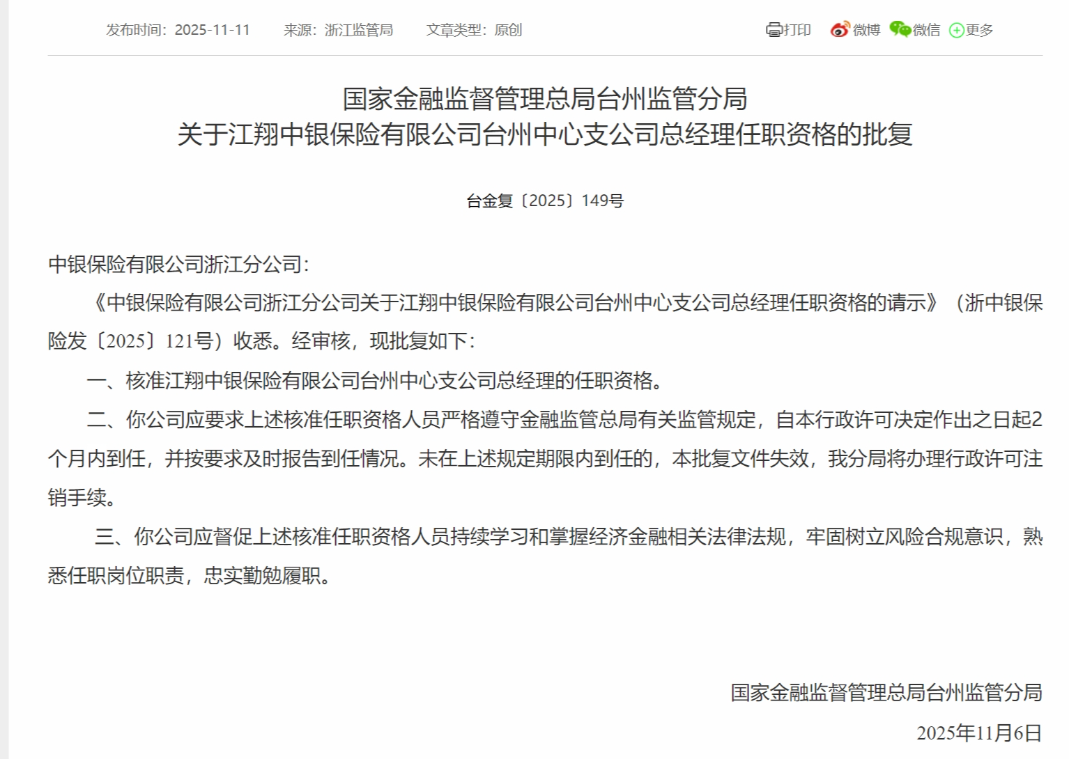 11月11日,国家金融监督管理总局台州监管分局发布关于江翔中银保险有限公司台州中心支公司总经理任职资格的批复股票配资神器,核准江翔中银保险有限公司台州中心支公司总经理的任职资格。