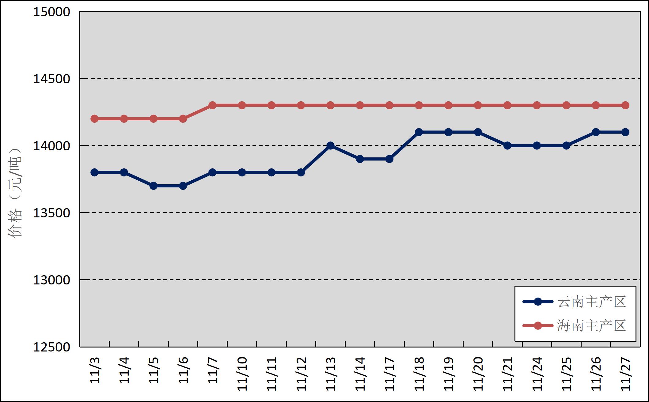 国内主产区:11月,云南产区生产较为稳定,原料正常释放,海南产区天气状况改善,原料价格波动不大。云南、海南鲜胶乳(折干胶)月均价格分别为13921元/吨、14279元/吨,环比分别上涨98元/吨、526元/吨。