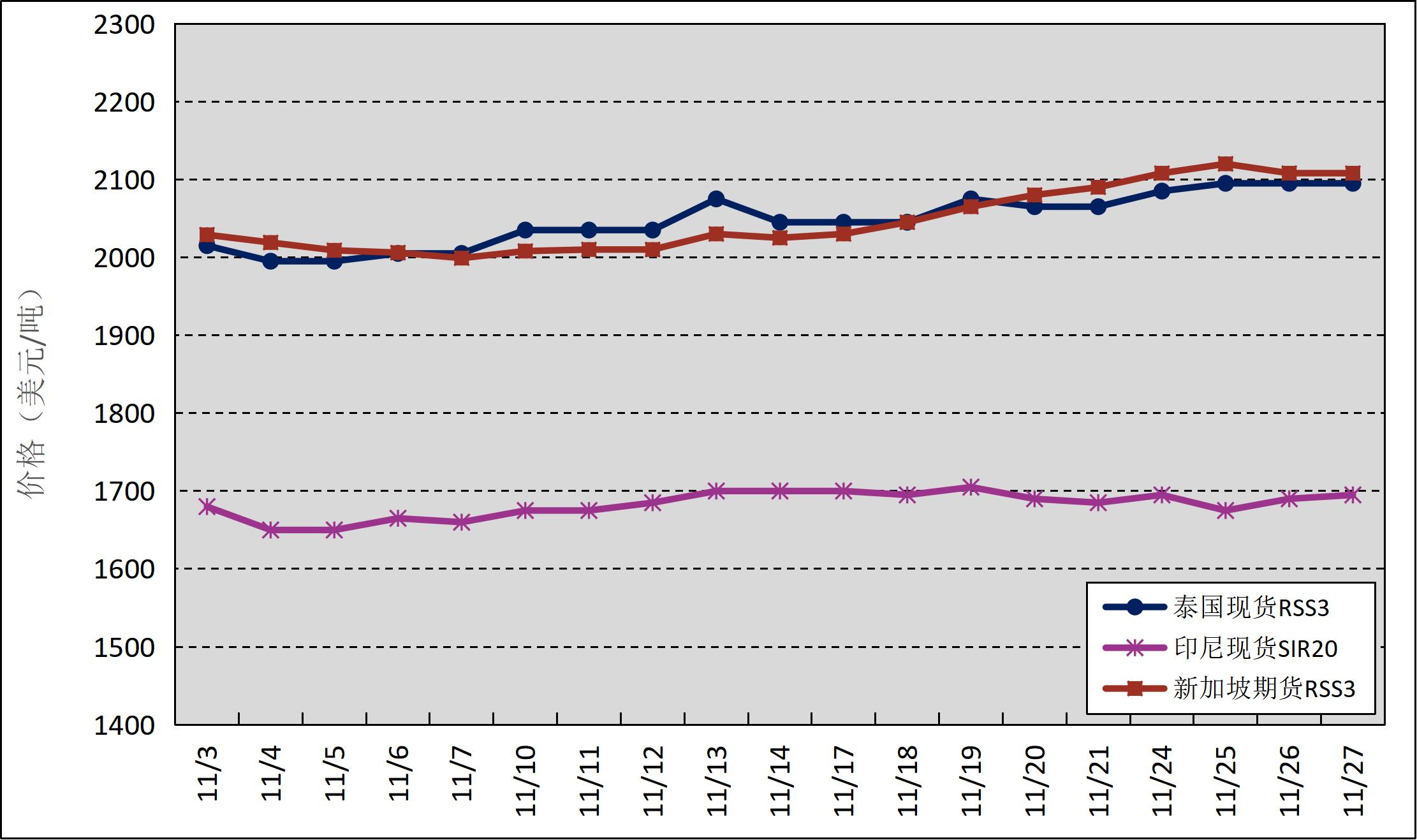 国外主产区:11月,泰国RSS3平均价格2048美元/吨,环比上涨6美元/吨,最高价2095美元/吨,最低价1995美元/吨;印尼SIR20平均价格1683美元/吨,环比下跌9美元/吨,最高价1705美元/吨,最低价1650美元/吨;新加坡RSS3期货主力合约月均结算价格2047美元/吨,环比上涨26美元/吨,最高价2120美元/吨,最低价1999美元/吨。