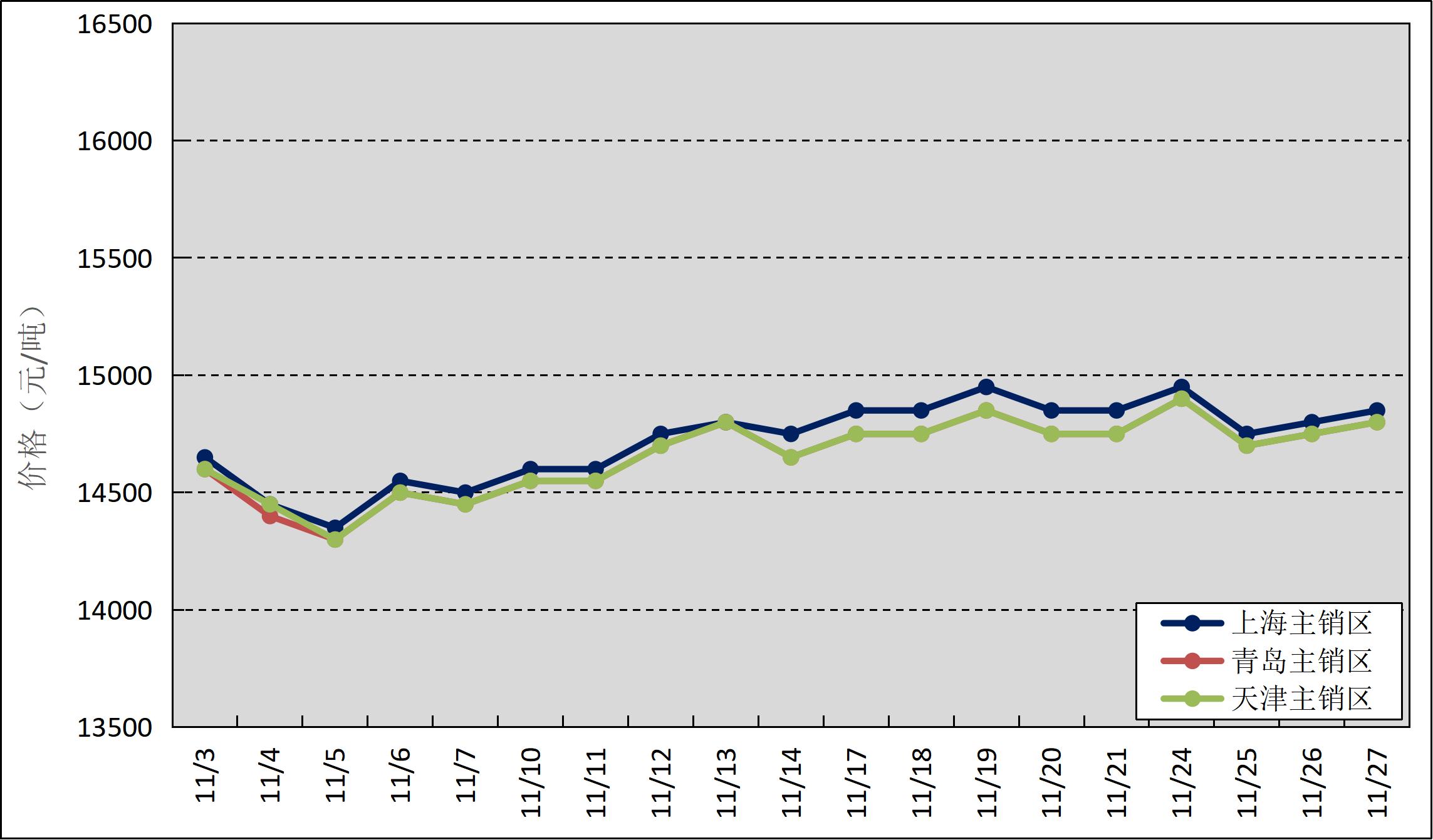 国内主销区:11月,国产全乳标准胶上海市场平均价格14721元/吨,环比下跌302元/吨,最高价14950元/吨,最低价14350元/吨;青岛市场平均价格14658元/吨,环比下跌227元/吨,最高价14900元/吨,最低价14300元/吨。天津市场平均价格14661元/吨,环比下跌281元/吨,最高价14900元/吨,最低价14300元/吨。