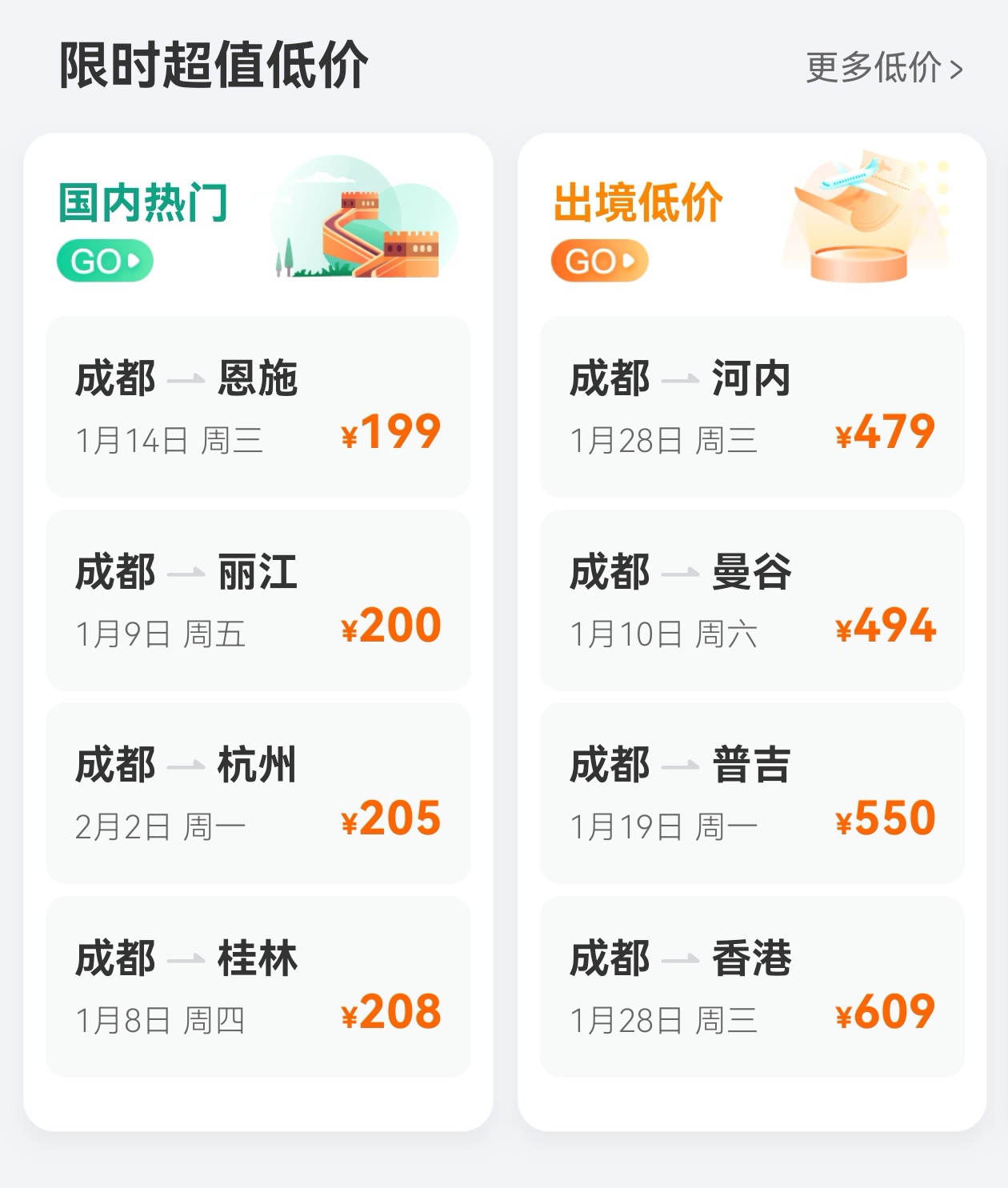 具体来看,成都至丽江、大理等旅游城市的部分航班,单程票价已低于300元,相当于原价的1-2折;前往西安、深圳、上海等主要城市的航线价格也明显下降,部分航班仍有低价余票可选。